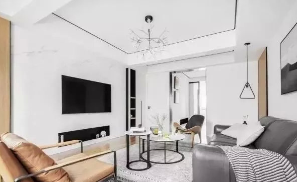 客廳還在茶幾兩邊,搭配了兩把座椅,其實(shí)也算是對沙發(fā)的一個(gè)補(bǔ)充,以避免不夠用的情況,同時(shí)也讓客廳相對豐富一些。電視墻大氣上檔次,中間是大理石上墻的設(shè)計(jì),因?yàn)槭前咨珟б恍┑y理,所以遠(yuǎn)看,還以為是大白墻一樣。吊頂上還走了一圈黑色線條。