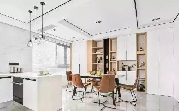 玻璃門進(jìn)來,就是餐廳、廚房區(qū)域,整個(gè)空間也是相通的,比較亮堂大氣,下圖詳細(xì)看。先來看一下餐廳,這里最突出的特點(diǎn),就是實(shí)用性強(qiáng)了,看墻壁上一直延伸到窗戶邊,都裝滿了柜子,有封閉式的,也有開放式的,總之不僅充當(dāng)了餐邊柜,更可以分擔(dān)居室一部分收納壓力,顏值也高,整體真心霸氣了。