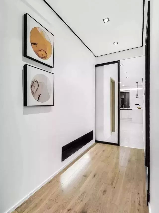 這其實(shí)是入戶玄關(guān)的一個(gè)走廊,一端是廚房、餐廳所在位置,這里是裝了透明的玻璃門給隔開了,這樣不影響視線的一個(gè)延伸線,就是比較通透,同時(shí)也擋住了油煙,或者說劃分了區(qū)域,使得都相對獨(dú)立。吊頂上裝了嵌入式筒燈,還有黑色線條勾勒,比較簡潔大方。