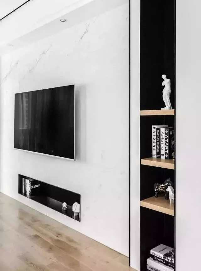 局部看,才能發(fā)現(xiàn)電視墻的個(gè)性與特點(diǎn)。那比如電視墻底部,設(shè)了壁龕,然后墻壁一邊,還有一列置物架,都是套黑色,黑白搭配,比較經(jīng)典不宜過時(shí),而且也符合居室的整個(gè)裝修特點(diǎn),當(dāng)然這些壁龕、置物架的設(shè)計(jì),也可以收納用,起到了一定的實(shí)用性。