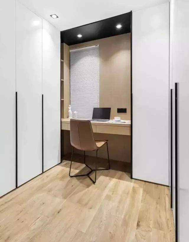 主臥里面有個(gè)衣帽間,空間相對較大,那么為了實(shí)用性更強(qiáng)一些,在衣帽間里還設(shè)了書桌,使得衣帽間多出一個(gè)辦公區(qū)域來,也是厲害。柜子都是通頂式設(shè)計(jì),白色柜面,搭配一字型黑色把手,高級(jí)感十足。而且儲(chǔ)物空間,綽綽有余了。