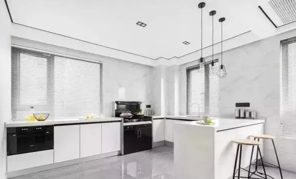 廚房是一個(gè)半開放式的設(shè)計(jì),因?yàn)橐贿呥€設(shè)了個(gè)吧臺(tái),作為隔斷。主要看廚房里,因?yàn)閴Ρ谏希皯粽紦?jù)多半,所以裝集成灶最為明智了,不占用墻壁空間,方便又省事了。廚房地面,是灰色系光亮瓷磚,墻壁是白色瓷磚,這看著有些冰冷的效果,其實(shí)最適合廚房。
