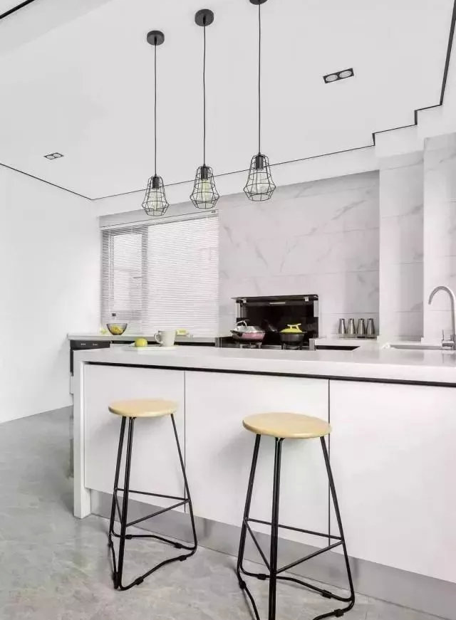 吧臺(tái)除了作為廚房、餐廳之間的區(qū)域劃分之外,還讓居室多出一個(gè)功能區(qū)來,布置一下還是蠻有情調(diào)的,上方懸掛了三盞吊頂,搭配兩把吧臺(tái)椅,平時(shí)簡單用餐,或作為其他用途,都可以的??傊葸@極其簡約、淺淡的個(gè)空間,都超符合年輕人審美。