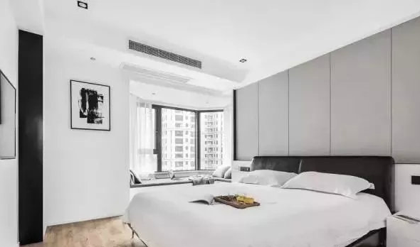 一般臥室為了營造更好的睡眠空間,通常色調(diào)宜溫馨一些,不過這里,還是迎合了居室的淺淡色系,以白墻為主,不過背景墻有進(jìn)行硬包設(shè)計(jì),是高級(jí)灰,顯得很大氣了。臥室有一個(gè)飄窗,向外凸出了,這里光線好,沒事可以坐在上面看看書、曬曬太陽都可以。