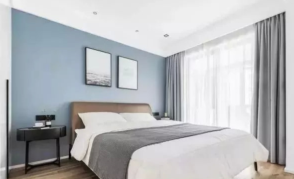 這是次臥,可以當(dāng)兒童房,色彩總算多了一些,背景墻刷了能清新一些的顏色。搭配掛畫、灰色窗簾、棕色床頭靠背等,還算豐富了。兒童房沒有裝主燈,以免拉低層高,裝一些筒燈來日常照明,其實(shí)就夠用了,效果好,還簡單方便。