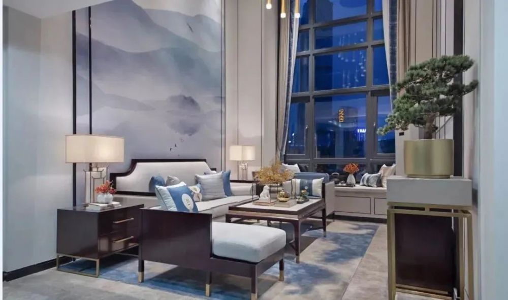 挑高的客廳空間,整體色調(diào)充滿了漸變的新中式風(fēng)格藍(lán)色元素,布置上新中式裝修風(fēng)格的家具,營(yíng)造出一種端莊與雅韻的端莊與意境感。布藝與木質(zhì)結(jié)合的新中式裝修風(fēng)格的沙發(fā),布置上大理石大面的大茶幾,使得空間充滿古韻與現(xiàn)代舒適的氣息。