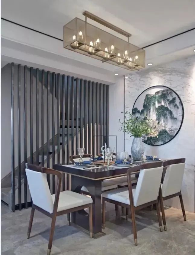 餐廳布置在樓梯旁邊,以黑色不銹鋼的屏風(fēng)隔斷樓梯與餐廳,餐廳背景墻上在大理石背景的基礎(chǔ),做一幅詩(shī)意的圓形山景裝飾畫(huà),結(jié)合古典端莊的餐桌,還有新中式裝修風(fēng)格質(zhì)感的皮質(zhì)坐墊餐椅,餐桌上精致的花瓶、餐具布置,使得用餐氛圍充滿現(xiàn)代優(yōu)雅的華麗氣質(zhì)。