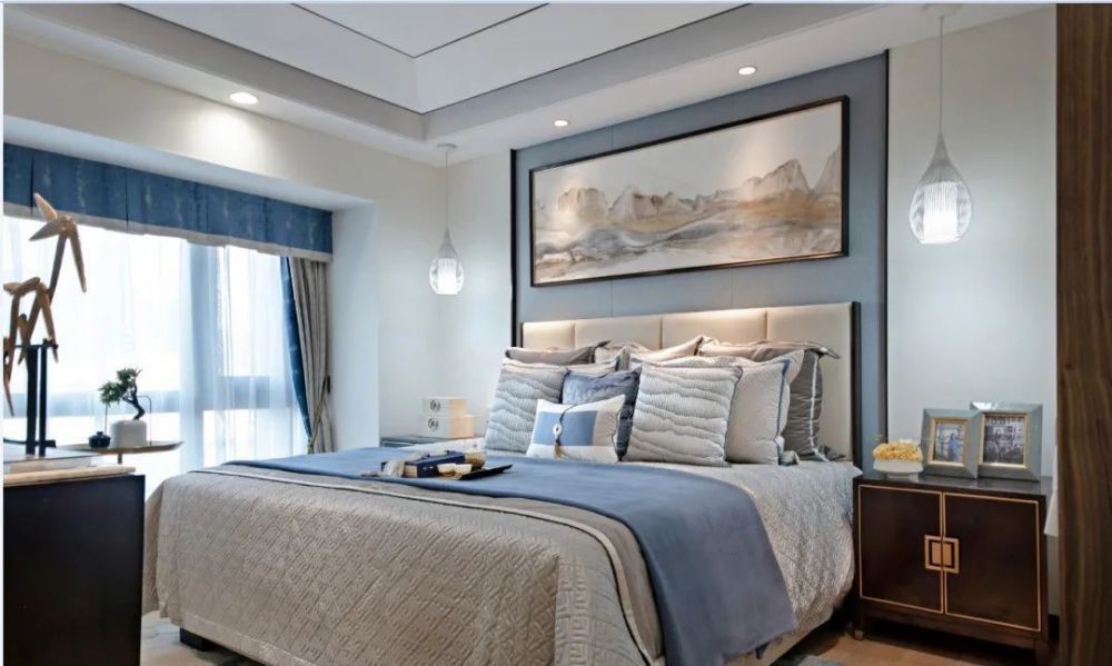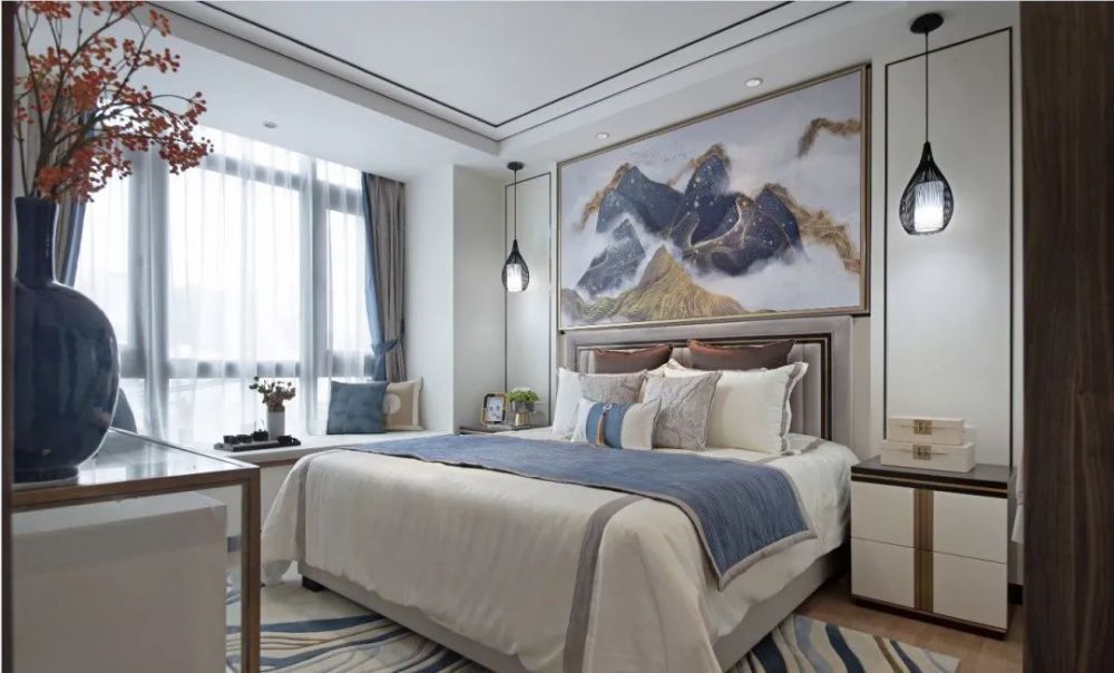 次臥的床頭墻上也裝了一幅古韻的山景畫(huà),天花與床頭墻的線條裝飾造型,還有皮質(zhì)的床鋪,多色拼接的地毯,也讓空間顯得更加的淡雅內(nèi)斂。