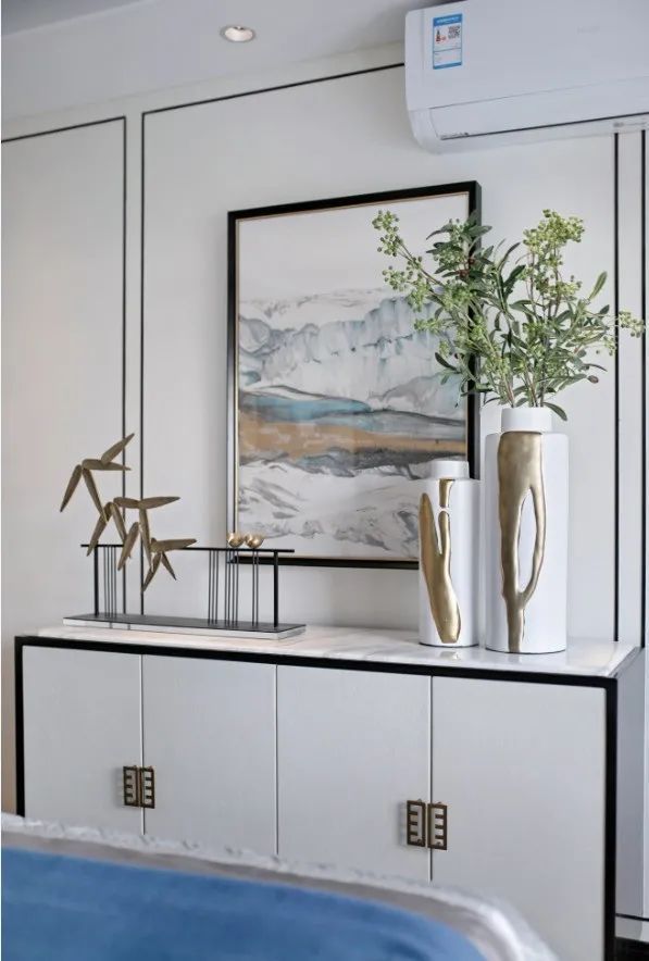 榮嘉裝飾將床尾位置布置上了一個(gè)斗柜,大理石臺(tái)面結(jié)合金屬與陶藝的花瓶擺飾,一幅山景的詩(shī)意裝飾畫(huà),也讓空間更加華麗檔次。