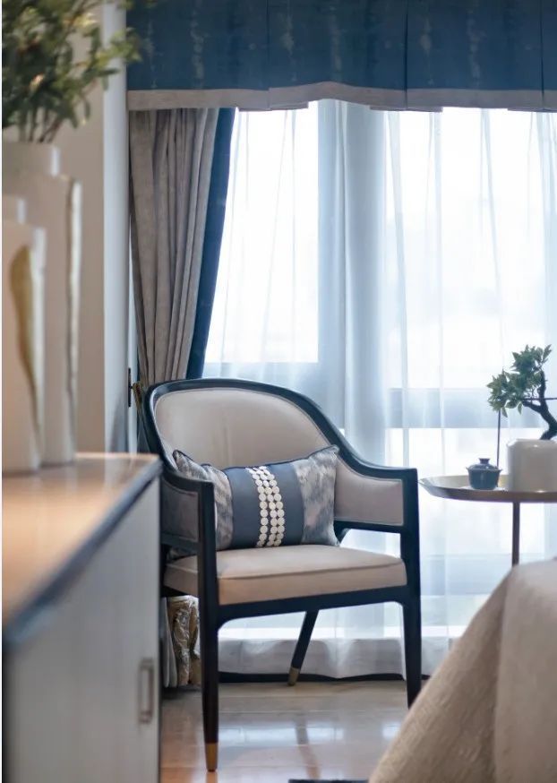 靠窗布置上一張休閑椅子,還有金屬托盤小茶幾,也讓空間充滿休閑愜意的體驗(yàn)。