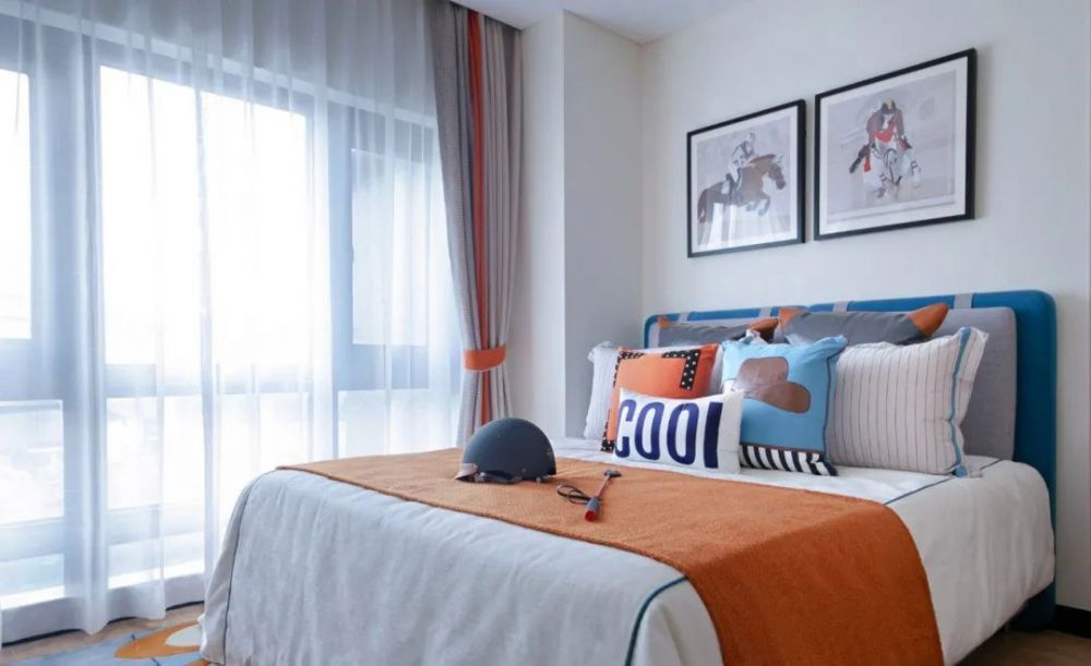 兒童房在簡(jiǎn)潔的空間基礎(chǔ),床頭墻掛上兩幅卡通主題的方形裝飾畫(huà),擺上精致鮮艷的床與床單,在藍(lán)色與橙色的碰撞下,讓兒童房空間充滿優(yōu)雅與活潑的氛圍感。