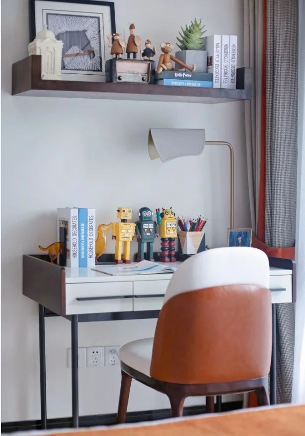 床尾位置的小書(shū)桌與書(shū)架,擺上書(shū)籍與機(jī)器人小擺件,顏色豐富的布置,呈現(xiàn)出一種別樣的童趣。