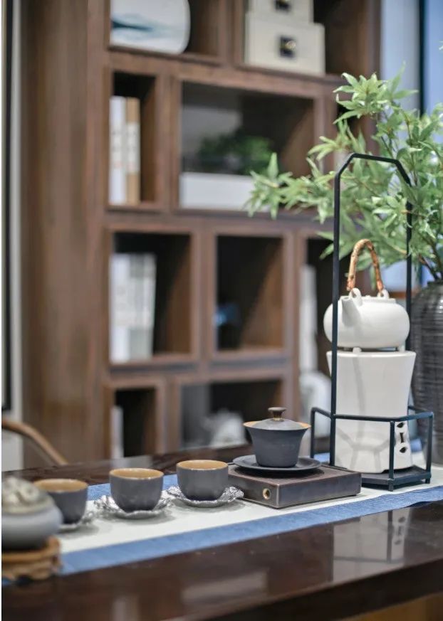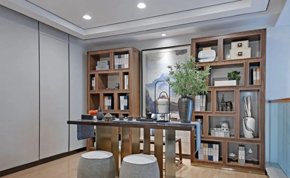 書(shū)房定制上一面獨(dú)特的書(shū)架,還有金屬質(zhì)感的書(shū)桌布置,兩張鼓凳,綠植與茶幾裝飾,讓空間充滿儒雅端莊的氣質(zhì)。