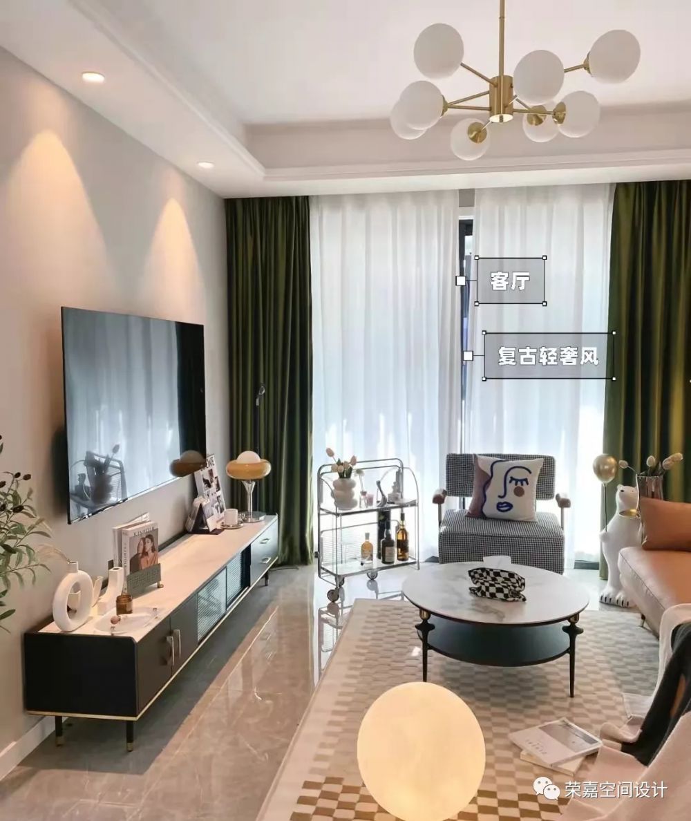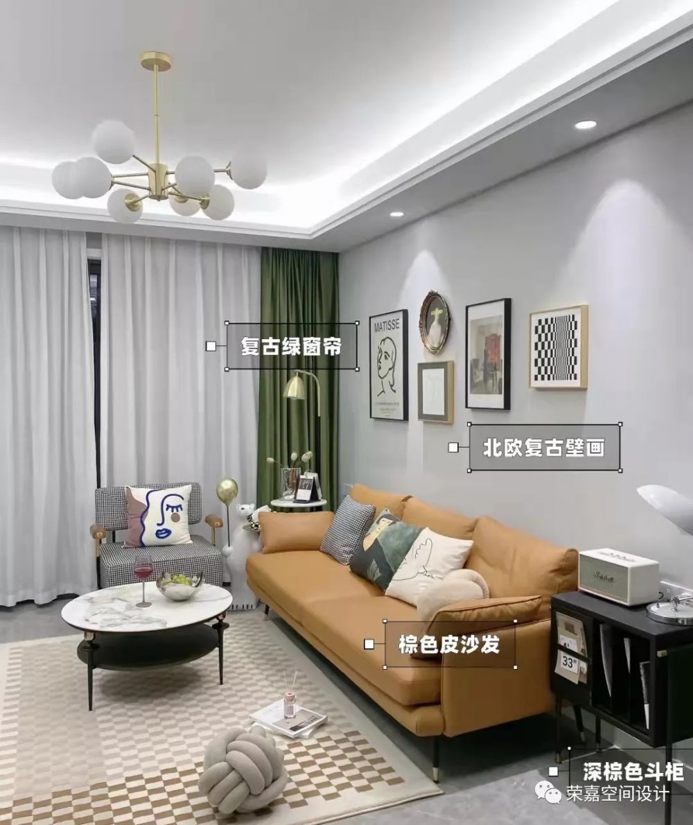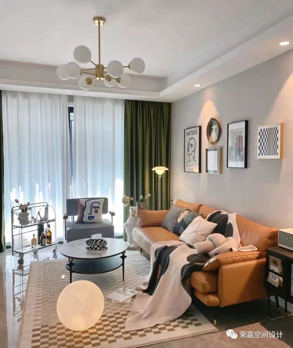 客廳選擇復(fù)古輕奢風(fēng),墻壁安裝射燈,讓客廳背景墻擁有美膩的小山丘,氛圍感一下子拉滿,以灰色為基調(diào),選擇偏暖色的棕色系沙發(fā),為緩解空間單調(diào)感,掛上幾幅大小不一、色彩鮮明的裝飾畫,豐富空間內(nèi)涵,橄欖綠窗簾加上復(fù)古棋盤格地毯,瞬間提升空間復(fù)古感。