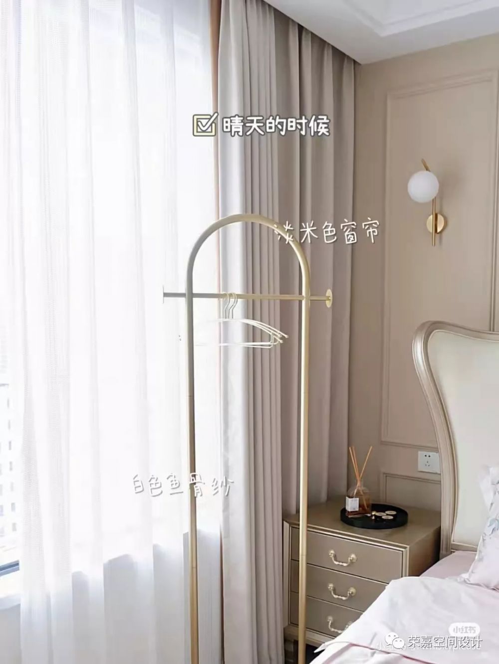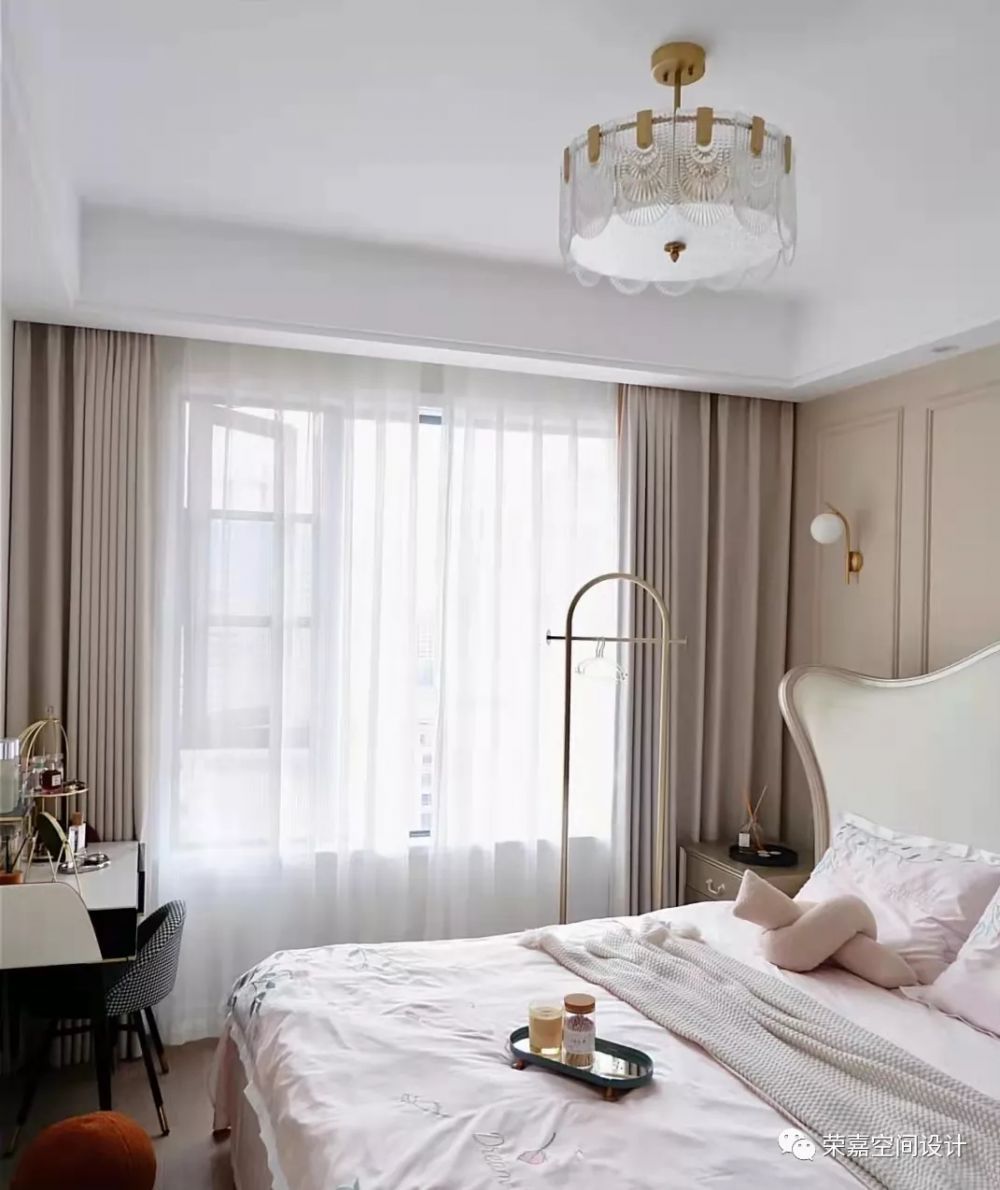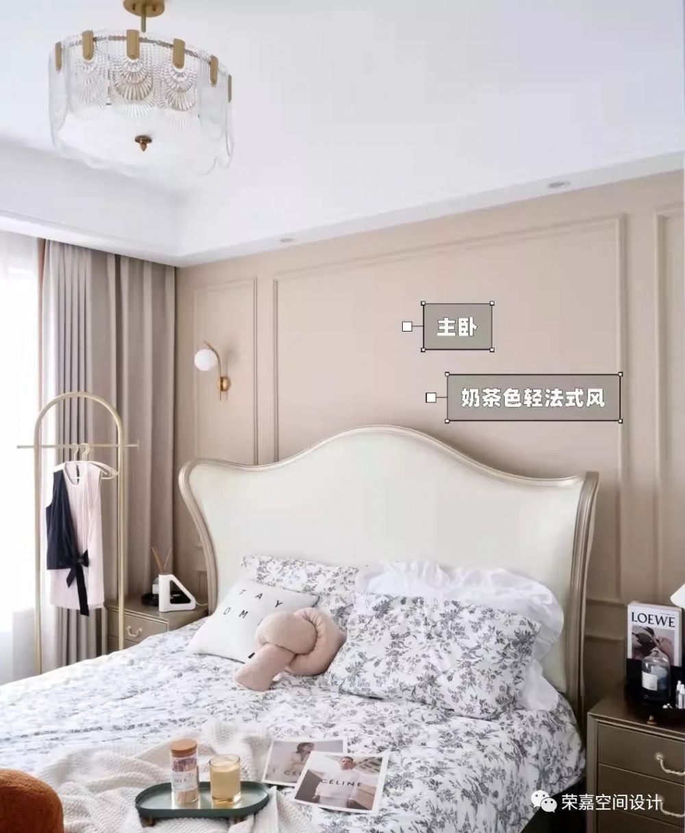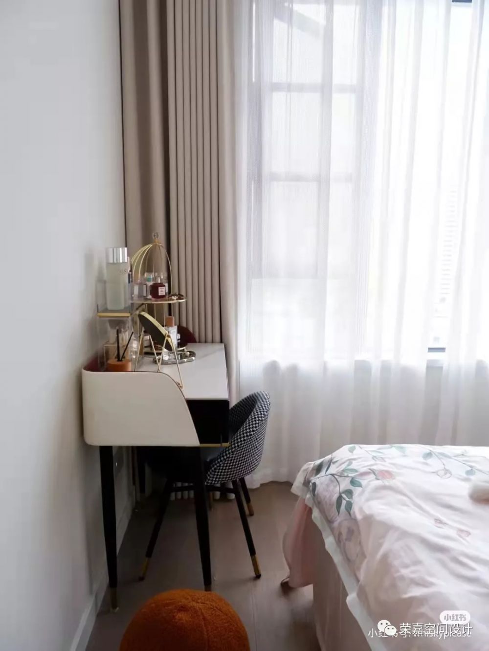 主臥選擇奶茶色輕法式風(fēng),奶茶色墻壁帶來家的溫暖,同色系床頭柜實用美觀。給人帶來文藝舒緩,舒服溫暖感。淡米色的窗簾搭配白色魚骨紗,床尾放上一個梳妝臺好看又實用。整個房間帶來了溫暖舒適安靜的效果。