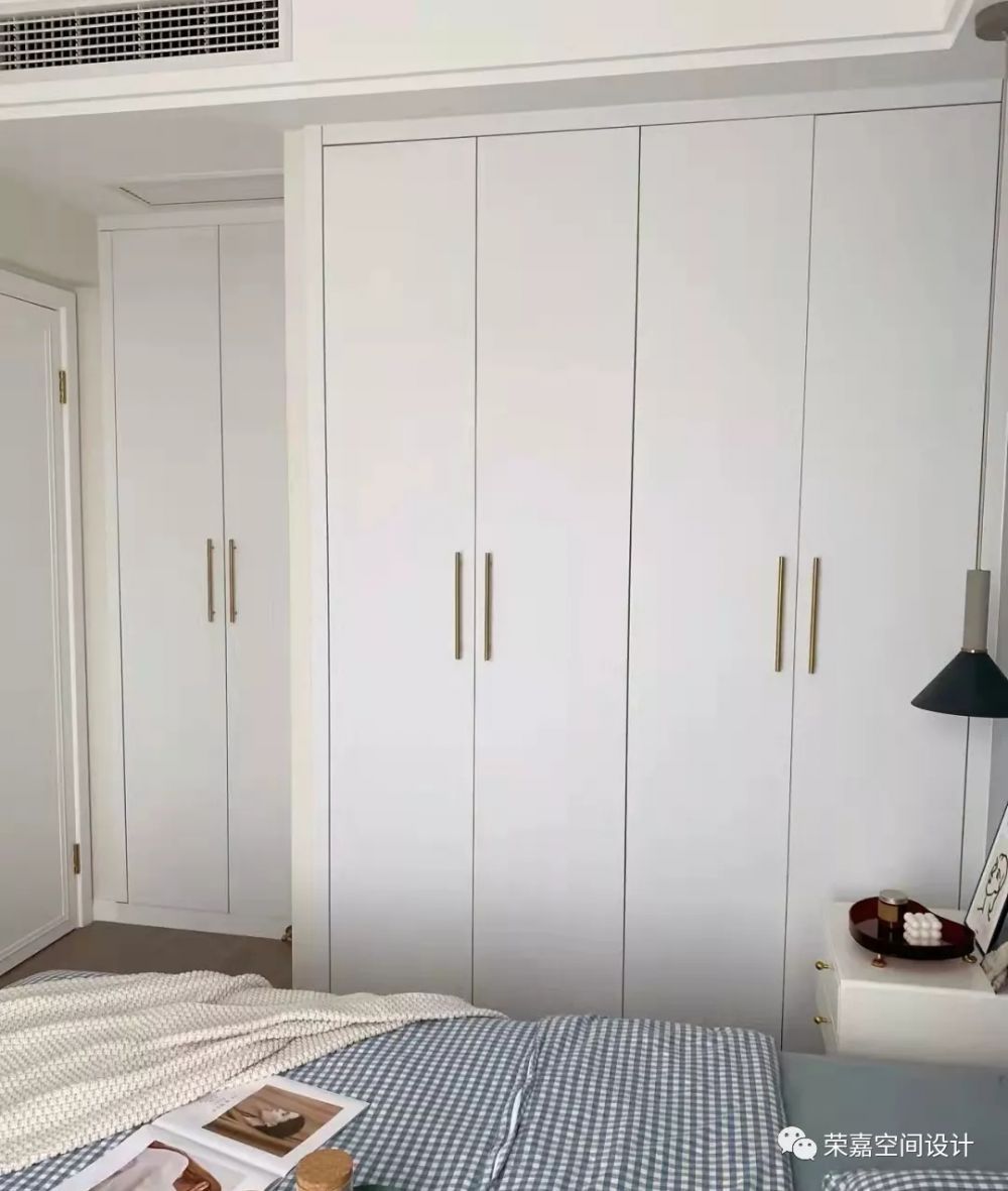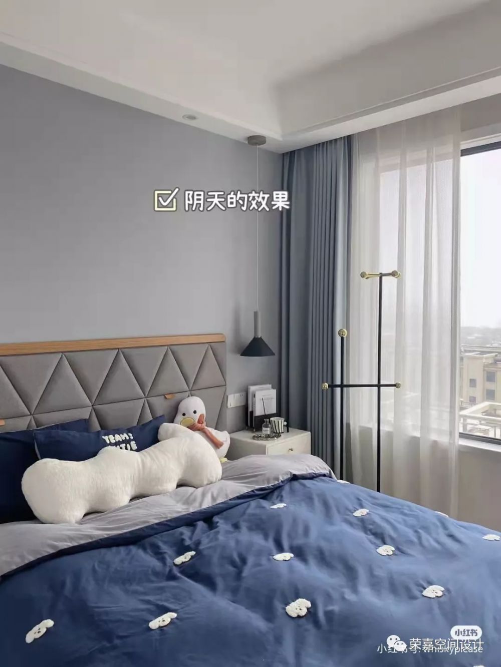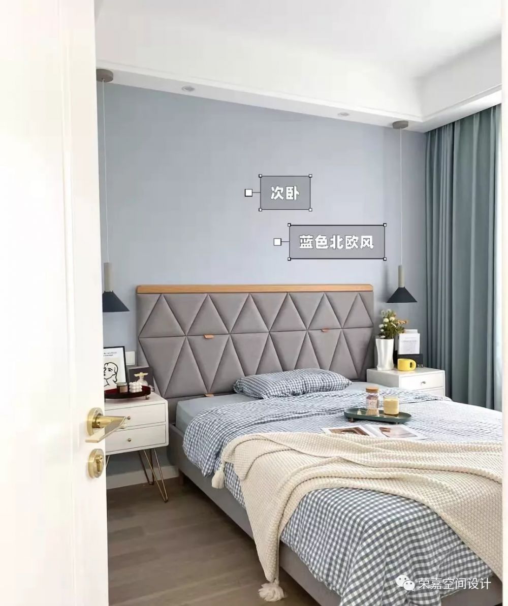 次臥選擇藍色北歐風(fēng),背景墻選擇馬蹄鐵+杏子灰,給人一種寧靜安詳?shù)母杏X,整面墻的衣柜,大大增加了儲物空間,窗簾也選擇了溫柔靜謐的水藍色,另外還搭配了溫柔的白色魚骨紗。小小的藍色次臥變得柔軟又治愈。