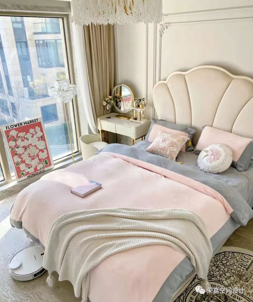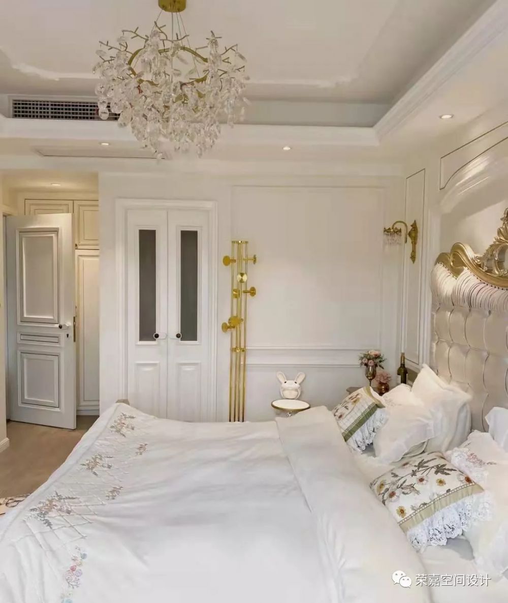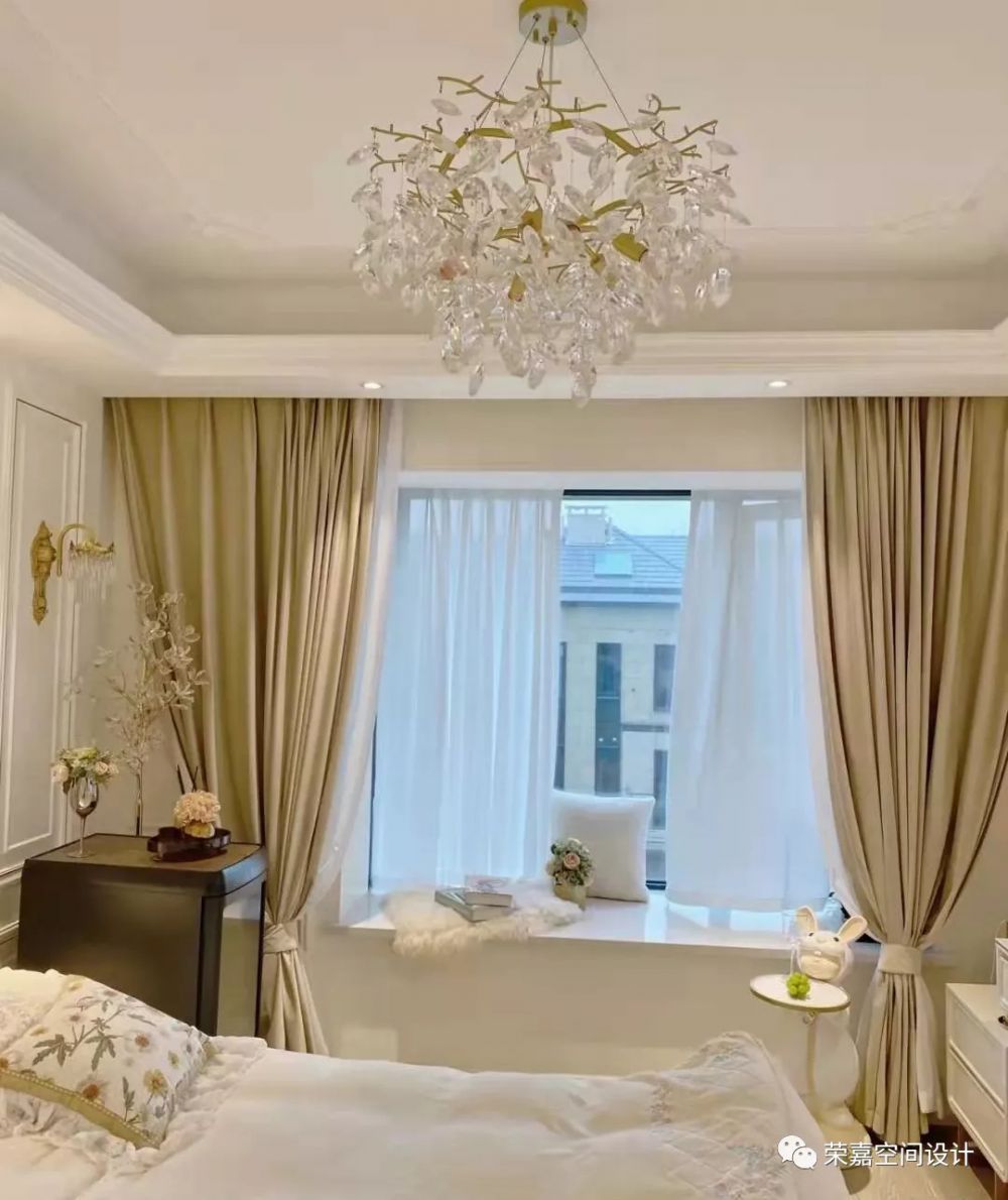 主臥整體顏色偏米白色,窗簾選用比利時絨杏色,垂墜度非常好。法式裝修怎么能沒有吊頂呢,搭配仙氣十足的水晶燈,氛圍感一下就拉滿了。床尾放置了一個同色系梳妝臺,好看又百搭。