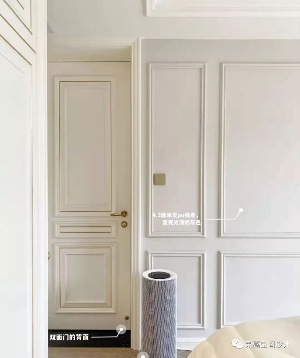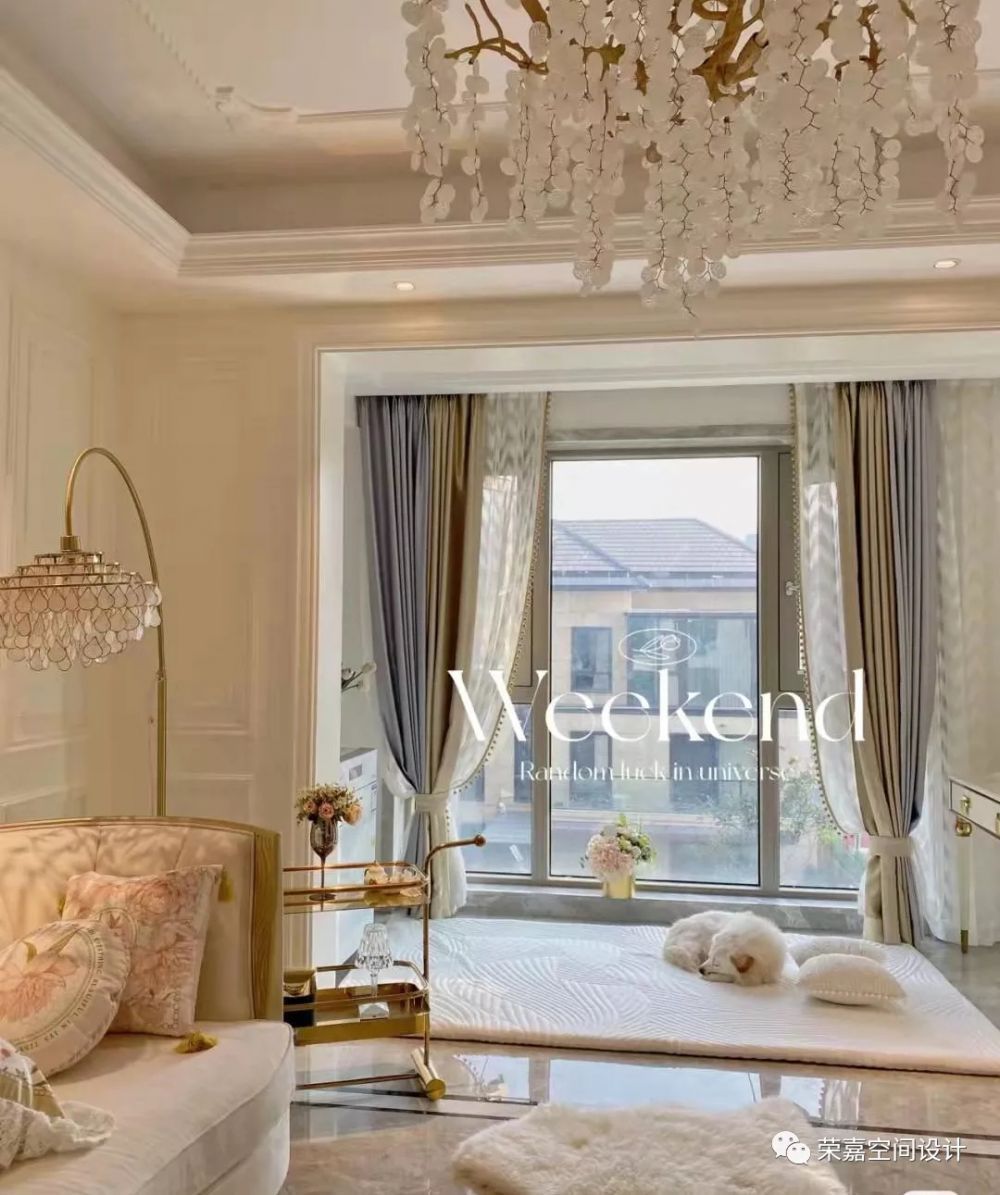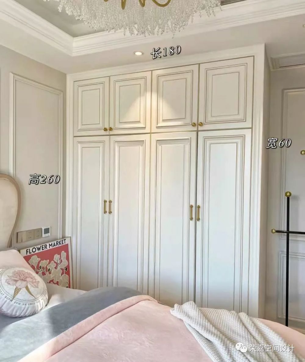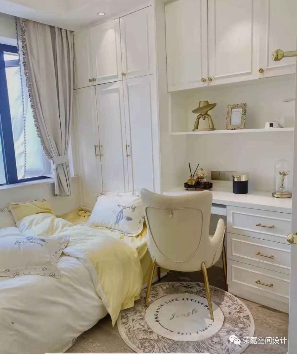 主臥整體顏色偏米白色,窗簾選用比利時絨杏色,垂墜度非常好。法式裝修怎么能沒有吊頂呢,搭配仙氣十足的水晶燈,氛圍感一下就拉滿了。床尾放置了一個同色系梳妝臺,好看又百搭。
