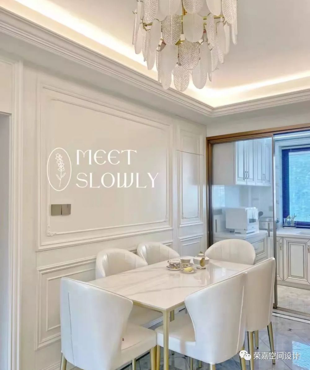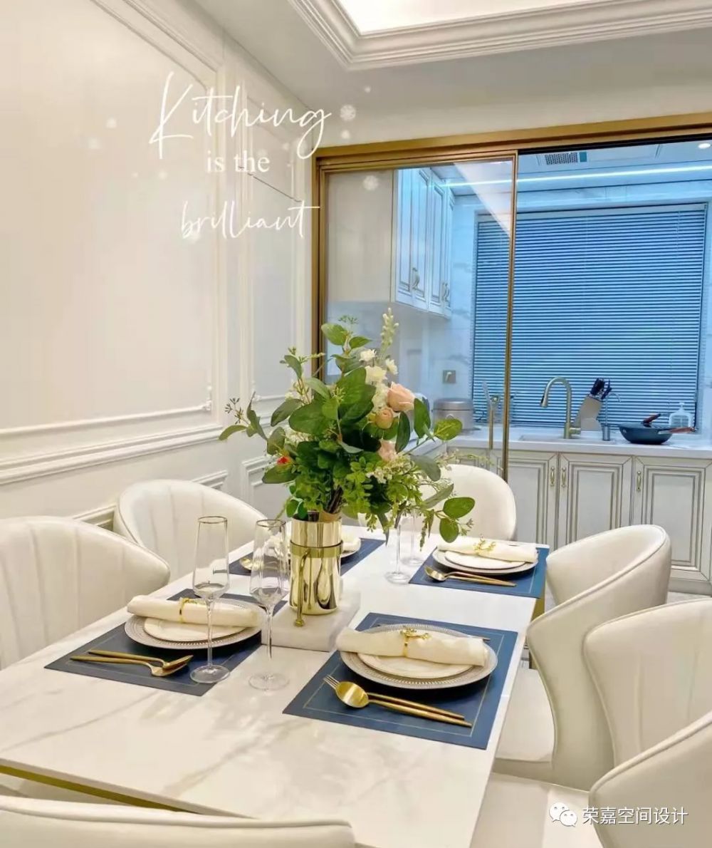 餐廳緊挨著廚房,在進門的左手邊,因為和客廳在同一個空間下,餐桌餐椅都選擇了奶白色,讓整體色彩更統一。