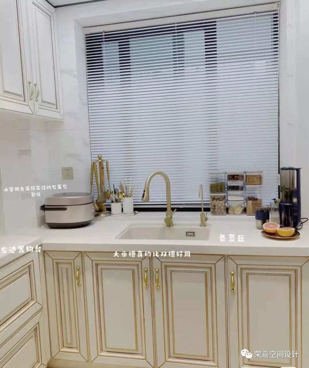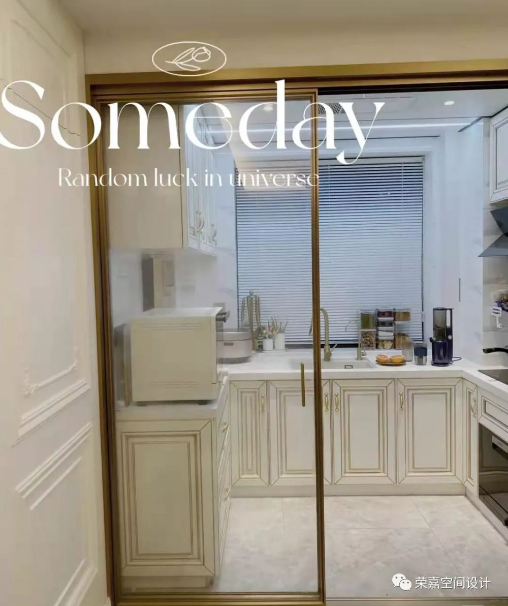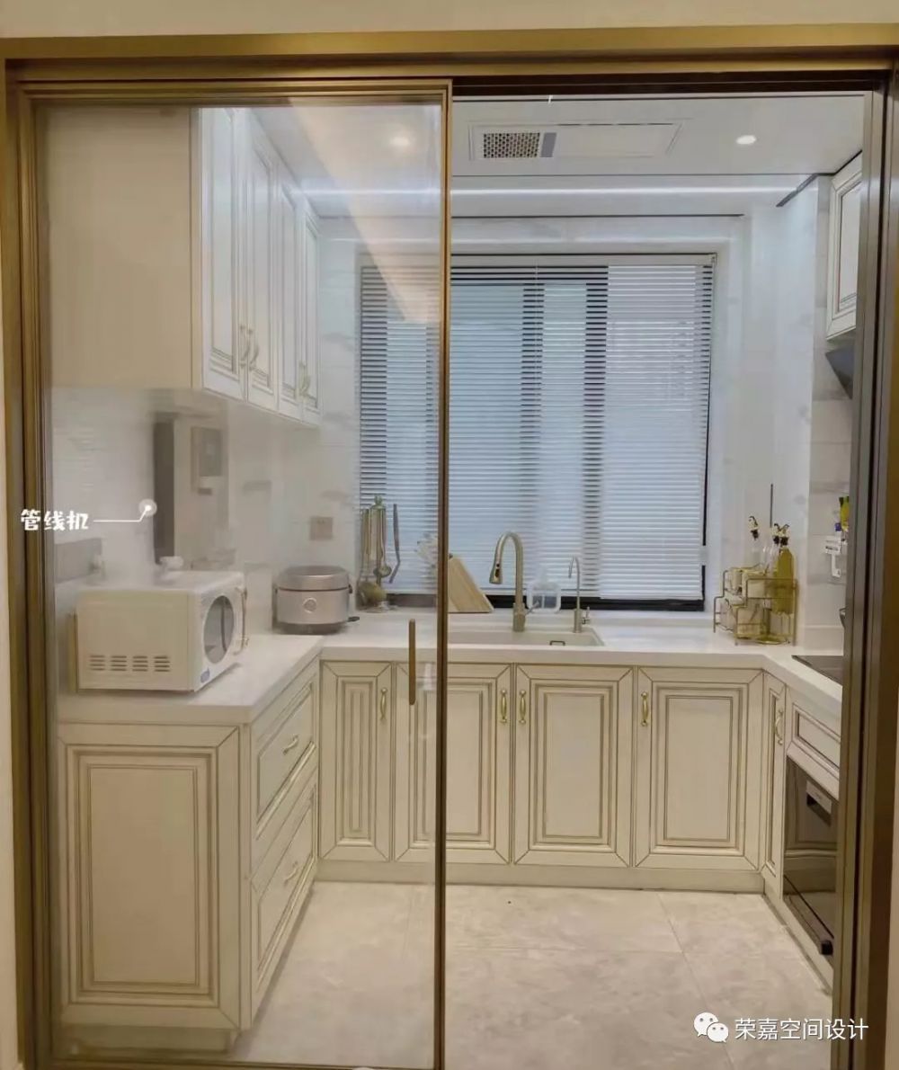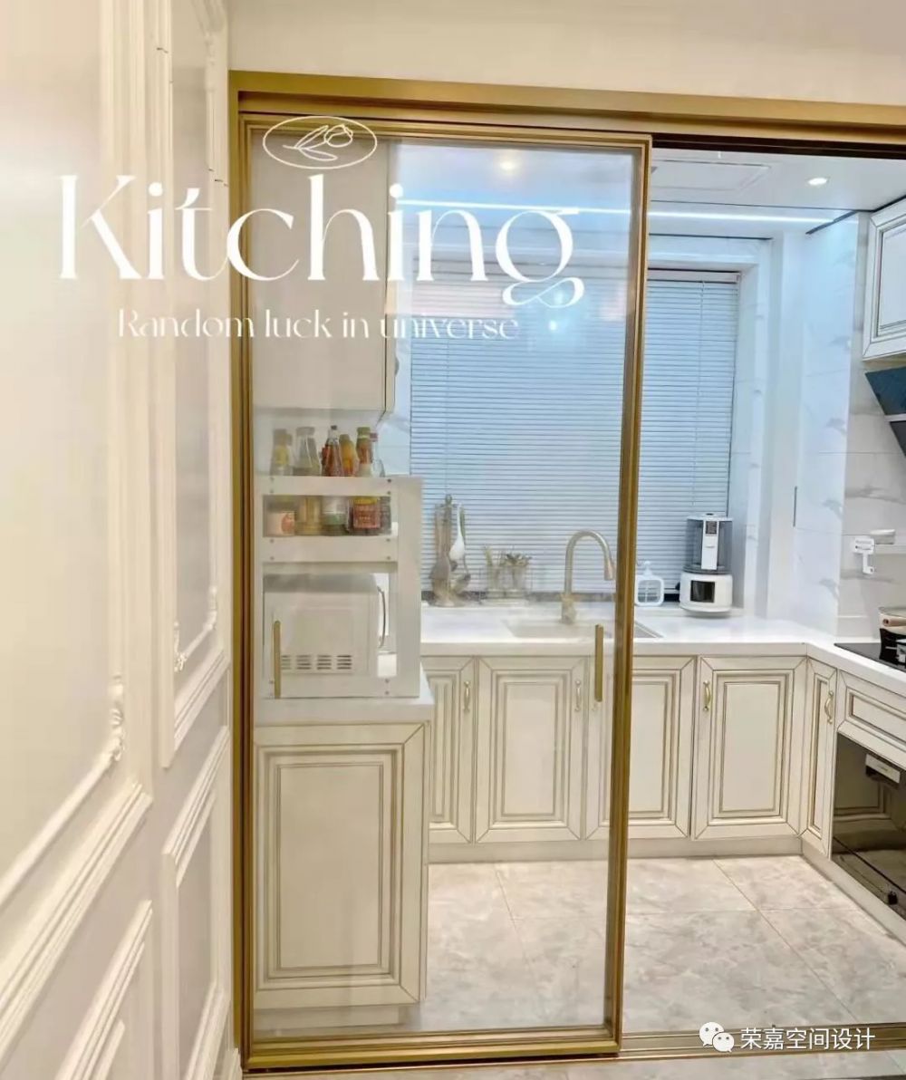 廚房面積不大,為了更合理的利用空間,使用了U型廚房。櫥柜整體是定制的,白色柜門搭配金色線條和把手,顯得奢華又大氣。中間是備菜區(qū),左邊可以放一些廚房小家電,右邊是炒菜去,廚房門用了透明的玻璃推拉門,更大化的利用空間。
