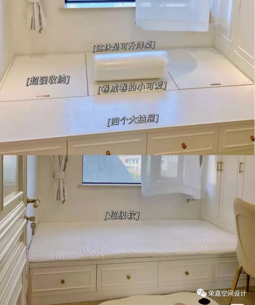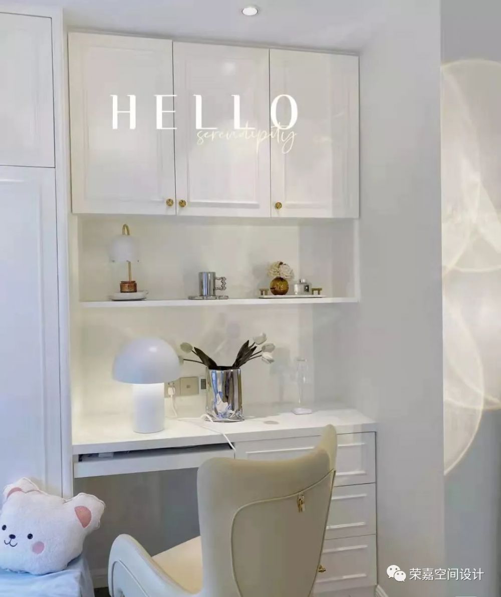 兒童房選擇的是榻榻米設計,是整個房子里房間最小,收納面積卻最多的?,F場打的柜子和床,嚴絲合縫。榻榻米中間有個升降桌,家里暫時沒有小朋友時候可以當做一個休閑房間。整面墻的柜子超強收納,旁邊有一個寫字臺。