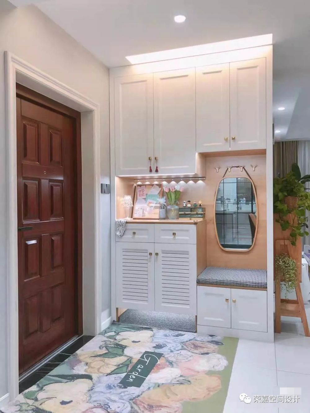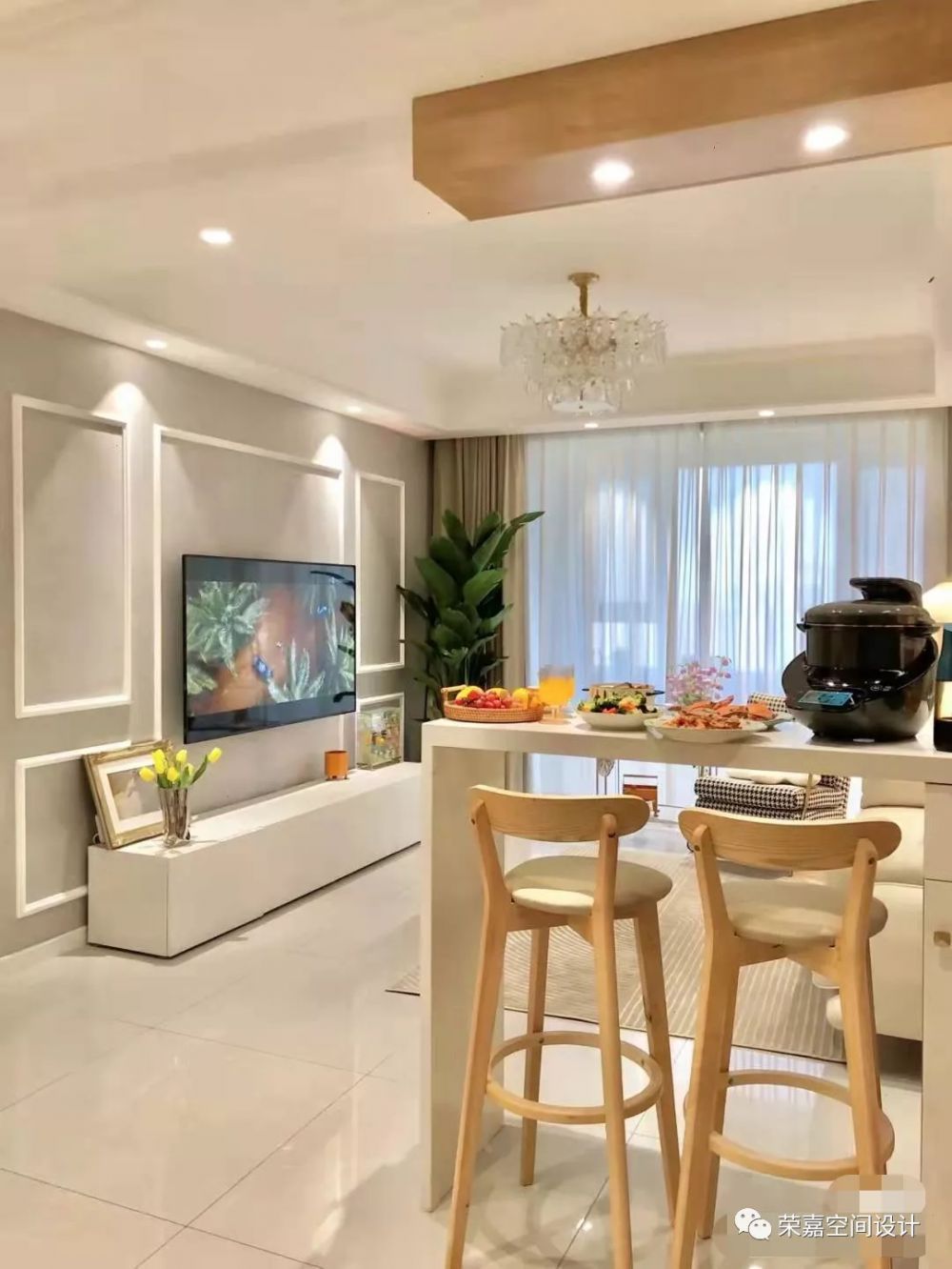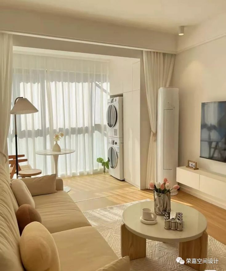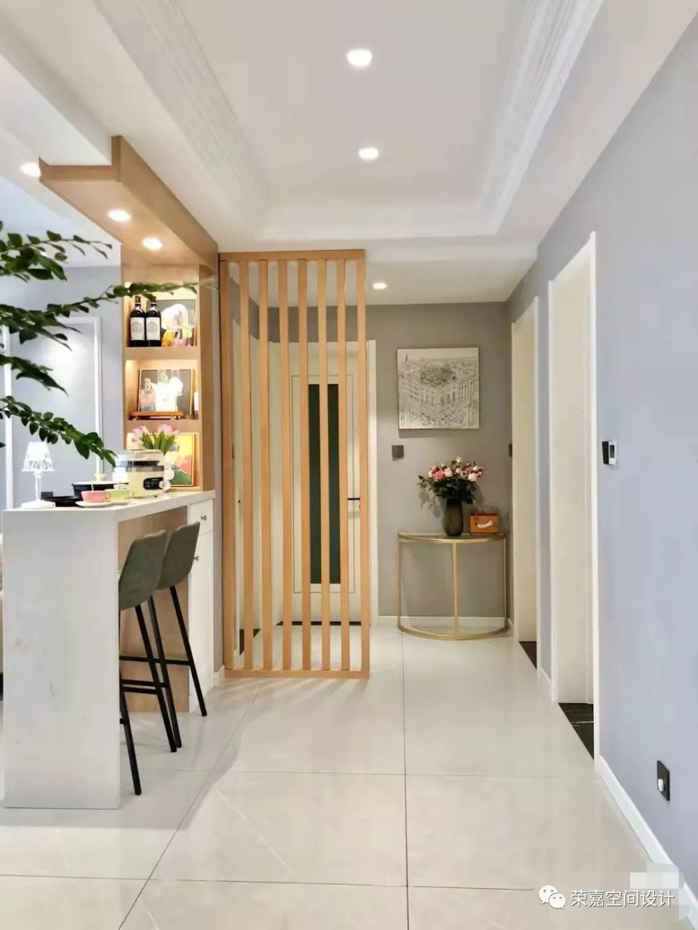 家永遠(yuǎn)是我們的避風(fēng)港灣,是我們心底最溫暖的地方~入戶門左邊做了頂天立地鞋柜,下層柜門設(shè)計(jì)了百葉窗,透氣性更好,距地面45cm設(shè)計(jì)了換鞋凳,中部設(shè)計(jì)了置物區(qū),并安裝了感應(yīng)燈。入戶門對(duì)面選擇條紋木板屏風(fēng),完美遮擋入戶門直對(duì)衛(wèi)生間門的尷尬。右邊是客廳,客廳硬裝非常簡單,淺灰色墻布背景墻,淺灰色的白紋地磚,顯得家里更通透,沙發(fā)和窗簾用的都是大面積的米白色??蛷d定制的吧臺(tái)是點(diǎn)睛之筆,平時(shí)可以在這里喝咖啡。
