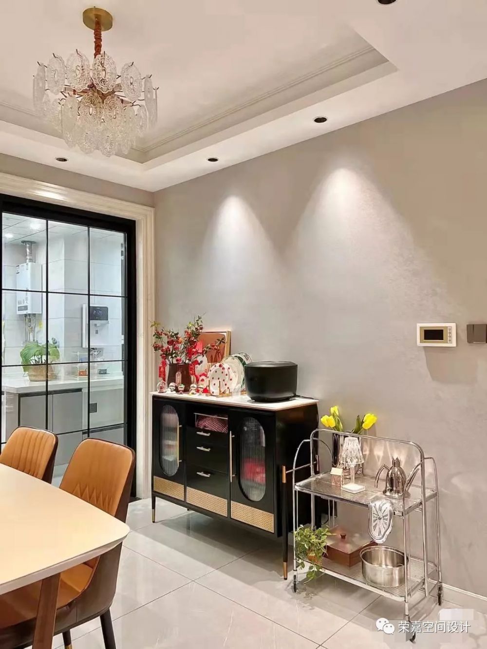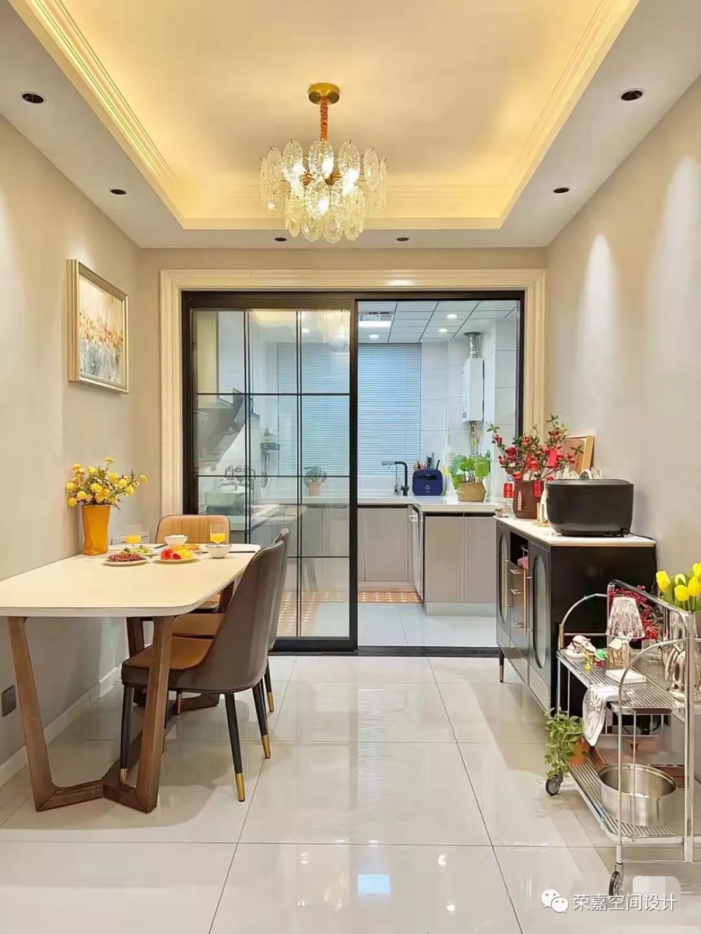 雖然天寒地凍,但人間溫暖。入戶門左邊就是餐廳,和客廳相連視野也更寬闊,餐邊柜和小推車用來做餐廳的輔助收納,彌補(bǔ)了沒有定制餐邊柜的遺憾。用餐時(shí)餐廳暖暖的燈光,在精致的水晶吊燈暖黃光的烘托下,食物也變得更加誘人,廚房有煙火,餐廳有歡笑,家里的氛圍感幸福到冒泡~