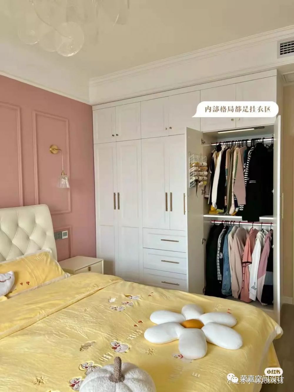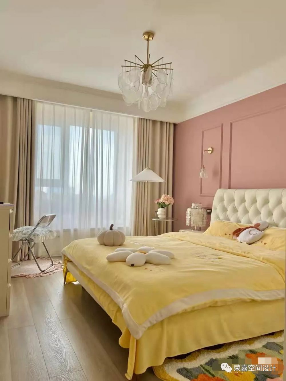 這是一間法式奶油系臥室,背景墻面是薔薇+奶咖,原木的實(shí)木地板搭配6cm的白色踢腳線。衣柜是整體定制的,選擇了大量的掛衣區(qū)。飄窗整個(gè)打掉重新定制的,下面做柜子,大大增加了儲(chǔ)物空間。床尾放置了梳妝臺(tái)和斗柜收納。整體浪漫又溫馨。