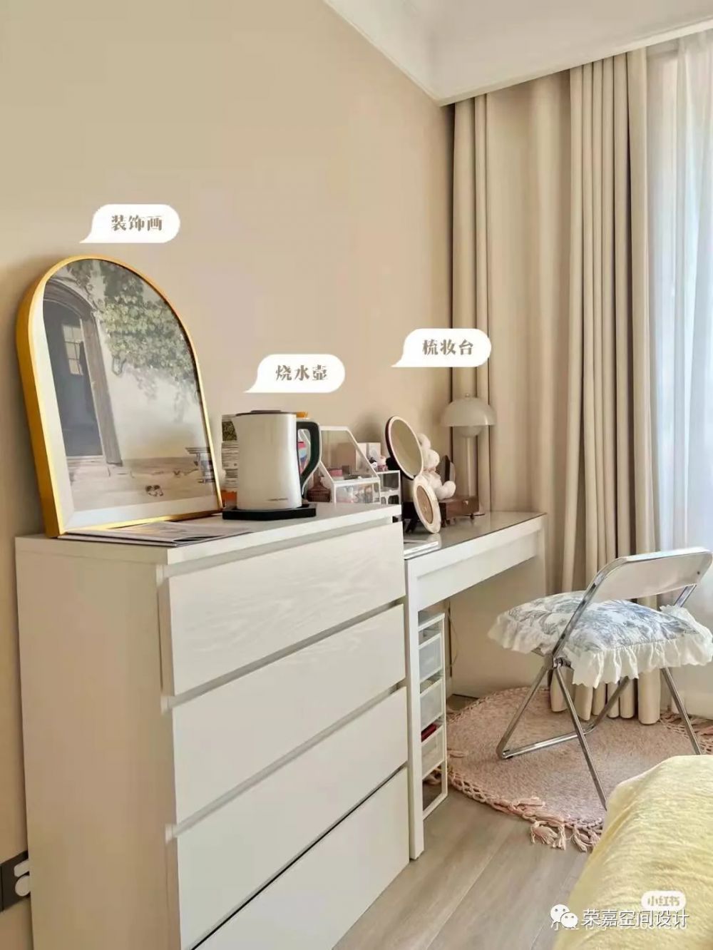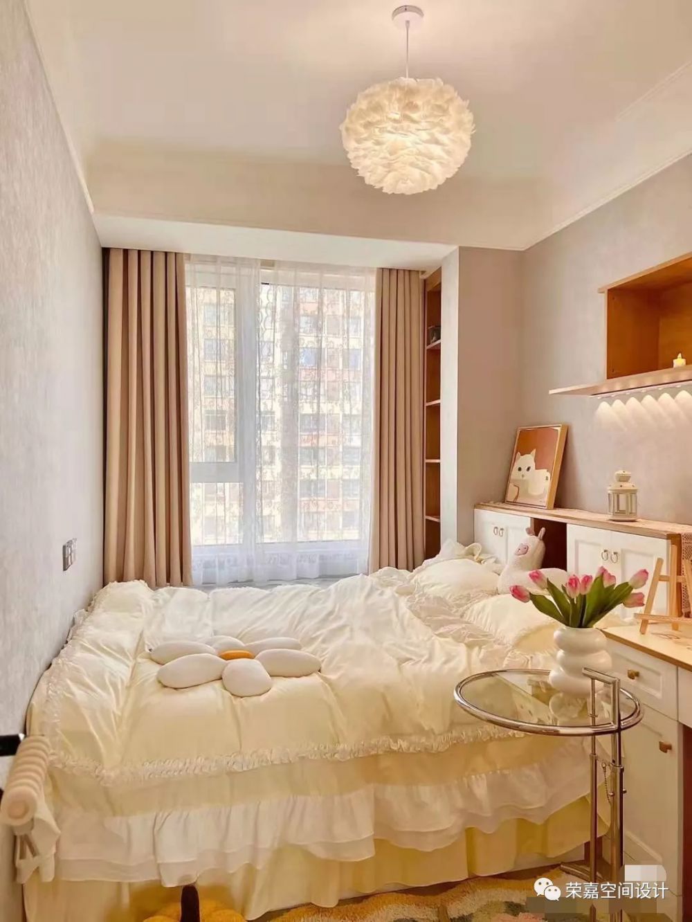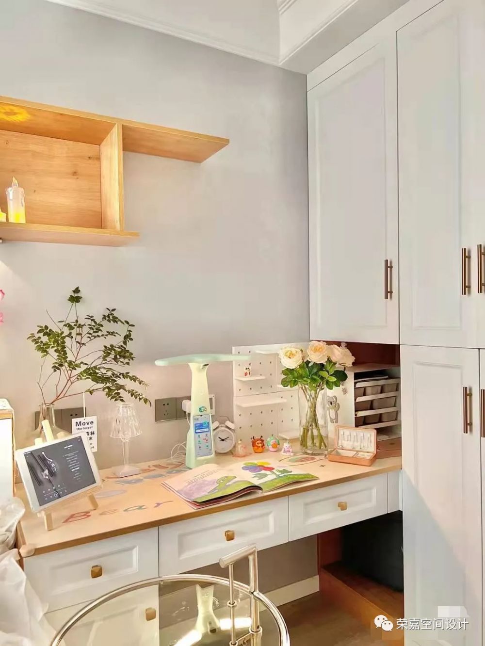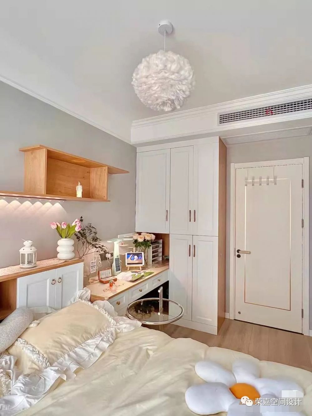 全世界都在催你長大,我卻希望你永遠(yuǎn)保持童心~次臥選擇了榻榻米房,總面積才八平方左右,小戶型想做到臥室和書房都要有的話,榻榻米設(shè)計(jì)真是不二的選擇,顏值+收納真的太棒了!床頭做好預(yù)留高度,方便開關(guān)柜門,床下可以做大抽屜,不需要取床墊直接取物。書桌和衣柜是定制的,奶白色柜門搭配實(shí)木色柜子,簡單又大氣。