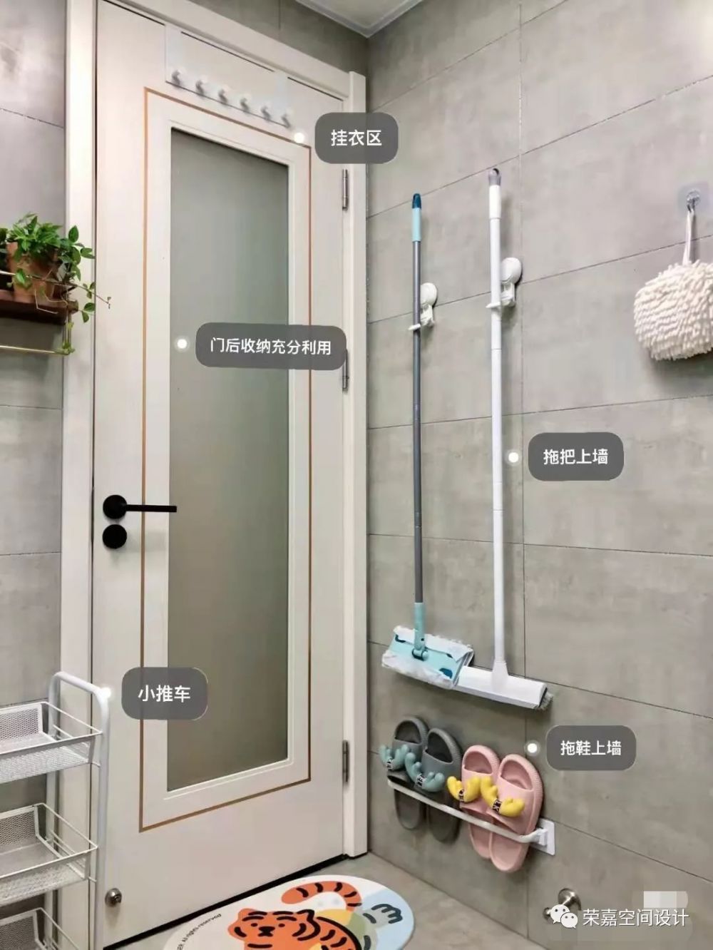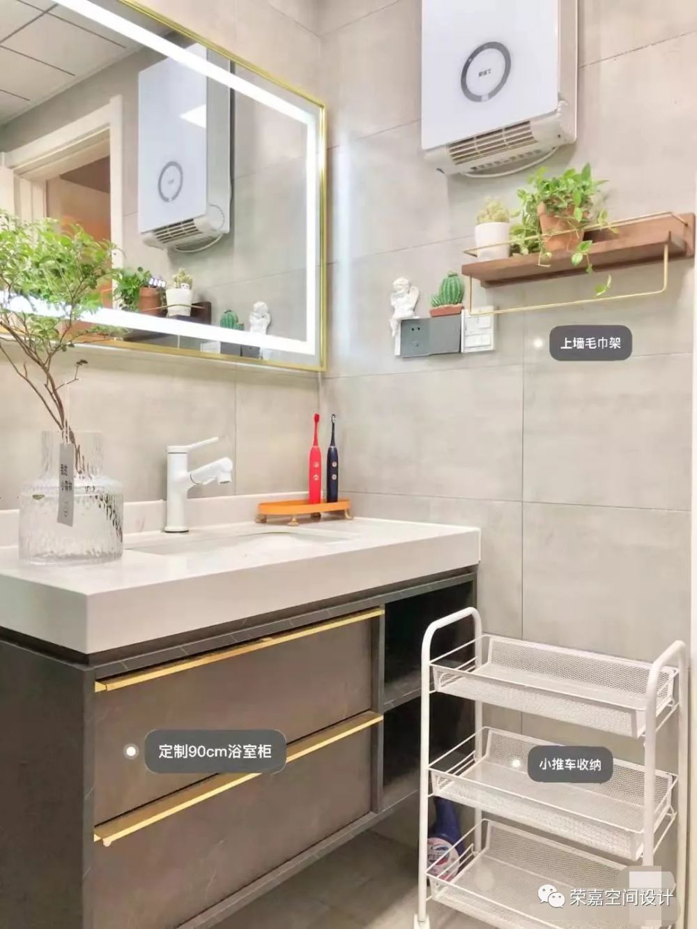 衛(wèi)生間只有四平米,所以淋浴房選擇了半圓形,可以節(jié)省面積。浴室柜是定制的,承擔(dān)了衛(wèi)生間大部分的收納。迷你衛(wèi)生間的門后當(dāng)然也是收納的重要位置,用起來超級(jí)方便。